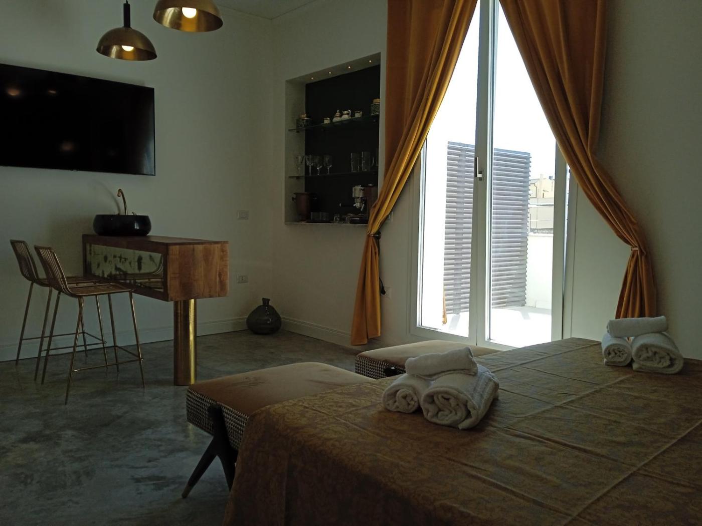 Camera King Deluxe. Ampia camera matrimoniale dotata di ingresso indipendente, aria condizionata, terrazza affacciata sulla città e bagno privato con doccia. L’alloggio presenta 1 letto. ;