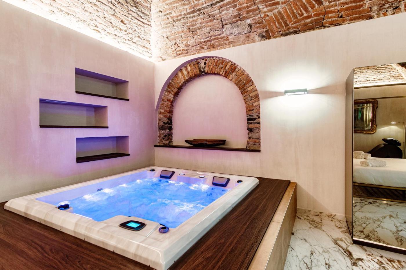Suite Deluxe con Vasca Idromassaggio. This suites standout features are the private pool, hot tub and spa bath. This suite consists of 1 living room, 1 separate bedroom and 1 bathroom with a walk-in shower and free toiletries. Guests can make meals in the kitchenette that is equipped with a stovetop, a refrigerator, kitchenware and a tea and coffee maker. Featuring a terrace with ancourtyard view, this suite also provides air conditioning and a flat-screen TV with streaming services. The unit offers 1 bed. ;
