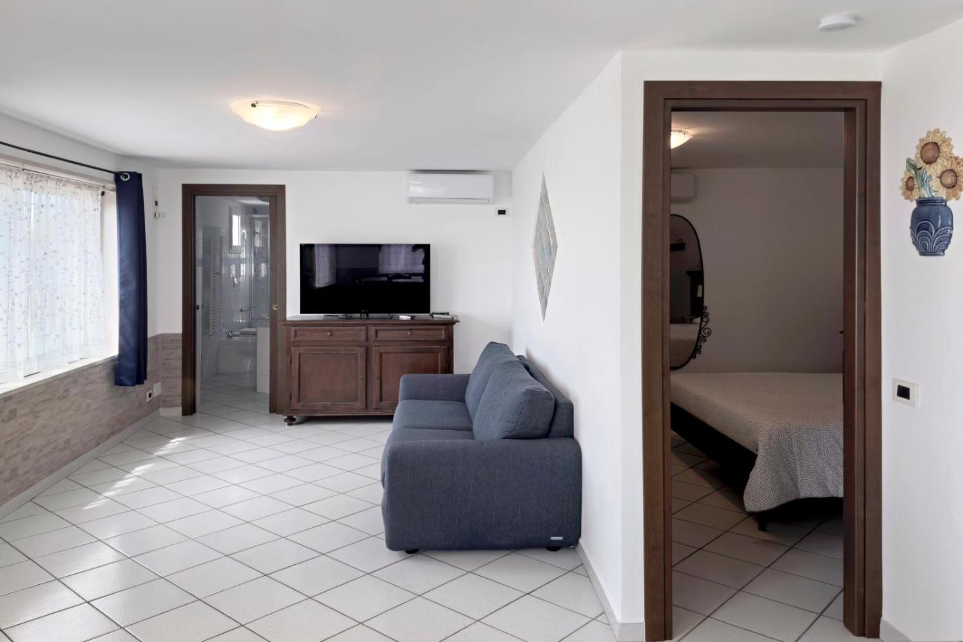 Appartamento con Vista Piscina. The pool with a view is the standout feature of this apartment. Featuring a private entrance, this air-conditioned apartment comprises 1 living room, 1 separate bedroom and 1 bathroom with a shower and a bidet. Meals can be prepared in the well-fitted kitchen, which comes with a stovetop, a refrigerator, kitchenware and an oven. Boasting a terrace with sea views, this apartment also provides a coffee machine and a flat-screen TV with satellite channels. The unit offers 1 bed.