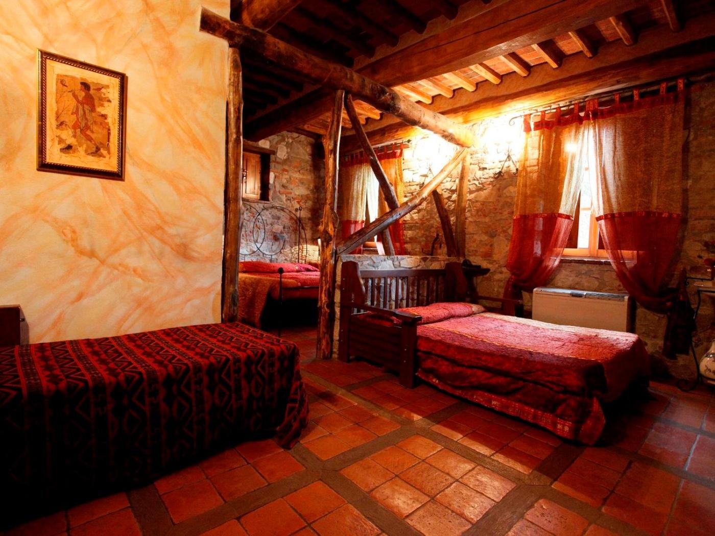 Arredate in stile medievale, tutte le sistemazioni della Corte Degli Dei presentano mobili tradizionali, pavimenti piastrellati e un bagno privato completo di asciugacapelli edi cortesia, mentre alcune vantano un letto a baldacchino.
