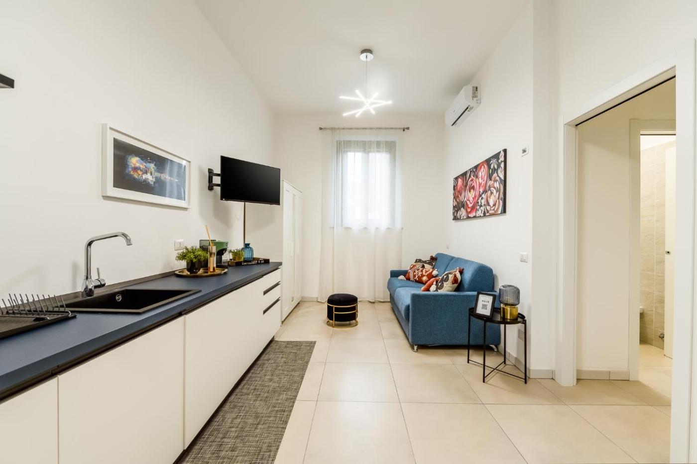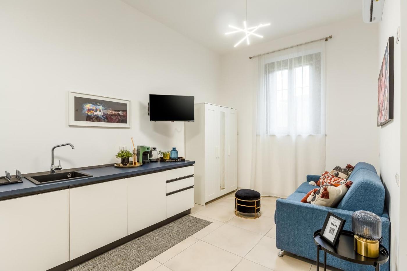 Monolocale con Divano-Letto. The studio offers a dining area, a wardrobe, as well as a private bathroom boasting a shower and a bidet. Meals can be prepared in the well-fitted kitchen, which has a stovetop, a refrigerator and kitchenware. This studio is air-conditioned and has a flat-screen TV with satellite channels, a washing machine, a private entrance and a tea and coffee maker. The unit has 1 bed. ;