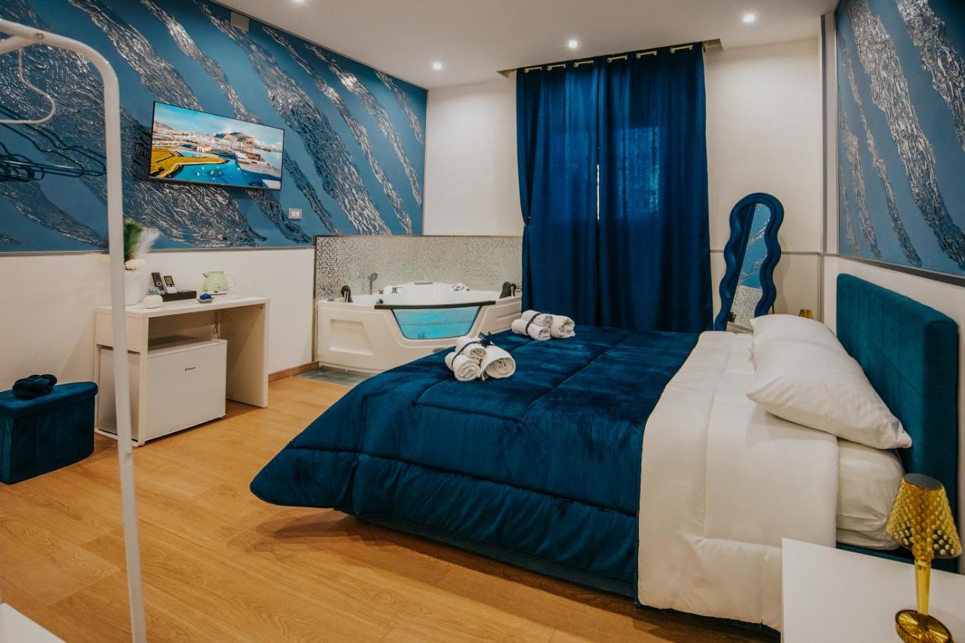 Camera Matrimoniale con Vasca Idromassaggio. La caratteristica speciale di questa camera matrimoniale è la vasca da bagno con idromassaggio. Questa camera matrimoniale climatizzata è dotata di TV a schermo piatto con servizi di streaming, bagno privato e terrazza con vista mare. L’alloggio presenta 1 letto. ;