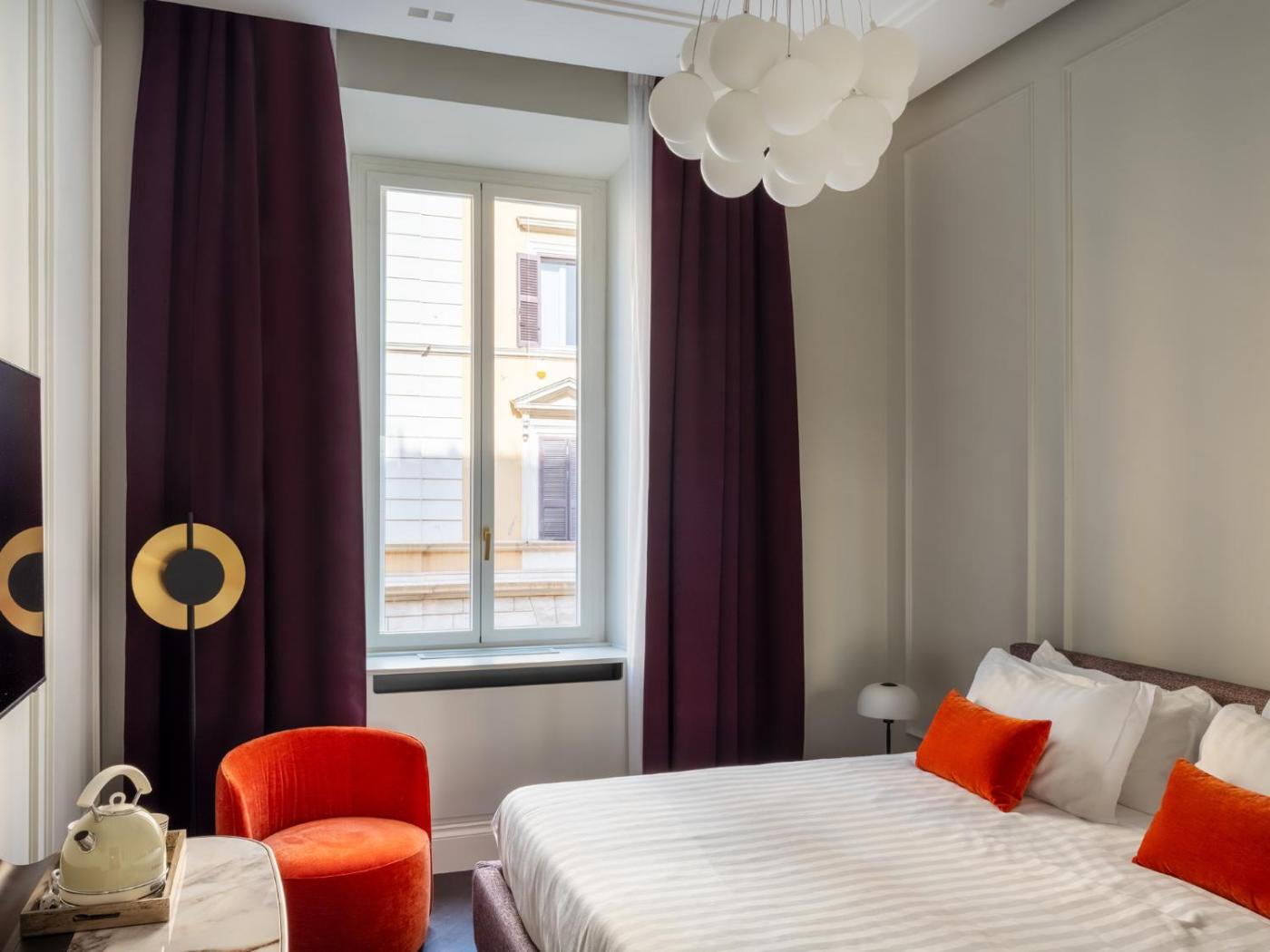 Camera Matrimoniale Deluxe. Camera matrimoniale provvista di bagno privato con doccia a filo pavimento, bidet, asciugacapelli edi cortesia. Questa sistemazione matrimoniale è dotata di aria condizionata, TV a schermo piatto con servizi di streaming, pareti insonorizzate, minibar,per la preparazione di tè e caffè e vista sul cortile interno. L’alloggio dispone di 1 letto.