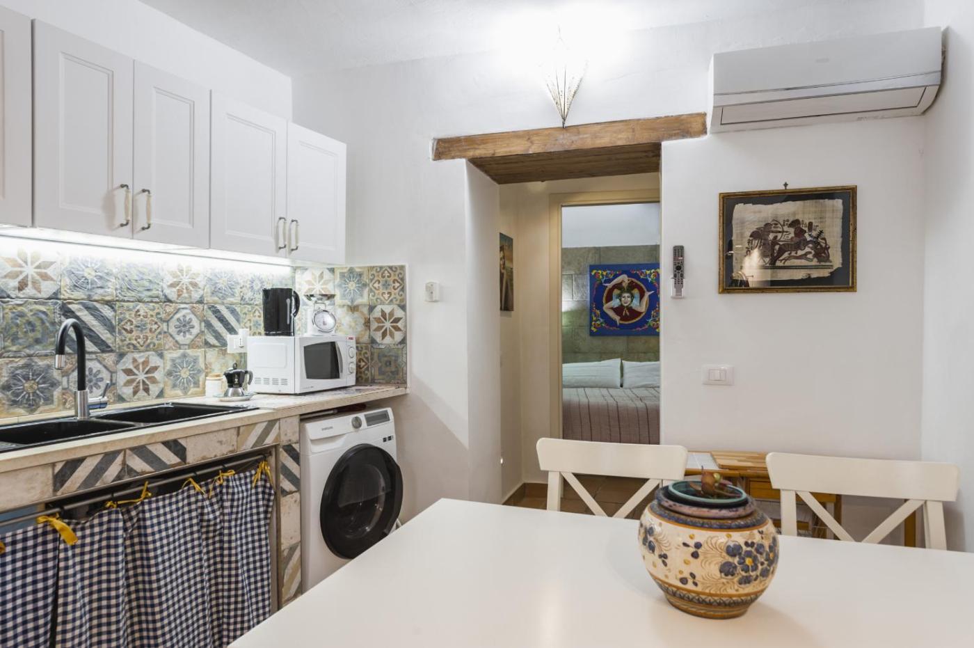 Appartamento - Piano Terra. The air-conditioned apartment has 2 bedrooms and 1 bathroom with a shower and a bidet. The well-fitted kitchen features a stovetop, a refrigerator, kitchenware and a microwave. The apartment features a washing machine, a seating area, a dining area, an electric kettle and a TV. The unit has 2 beds.