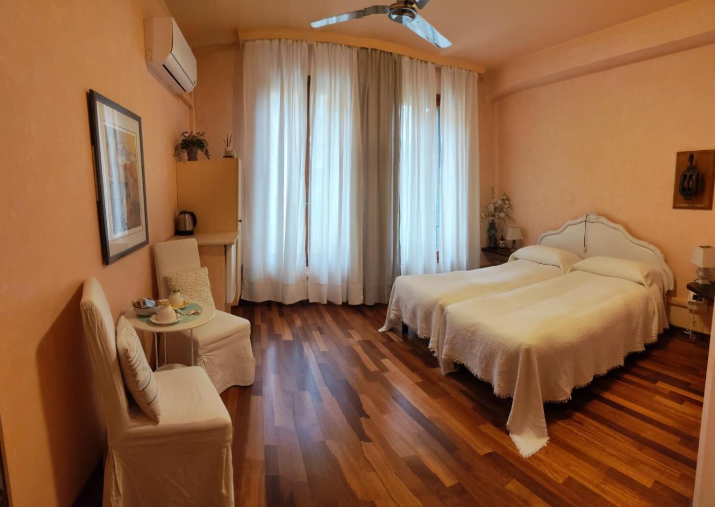 Camera MatrimonialeDoppia con Letti Singoli. Camera doppia con letti singoli dotata di pavimenti in legno e frigorifero. Il bagno privato include una doccia. ;